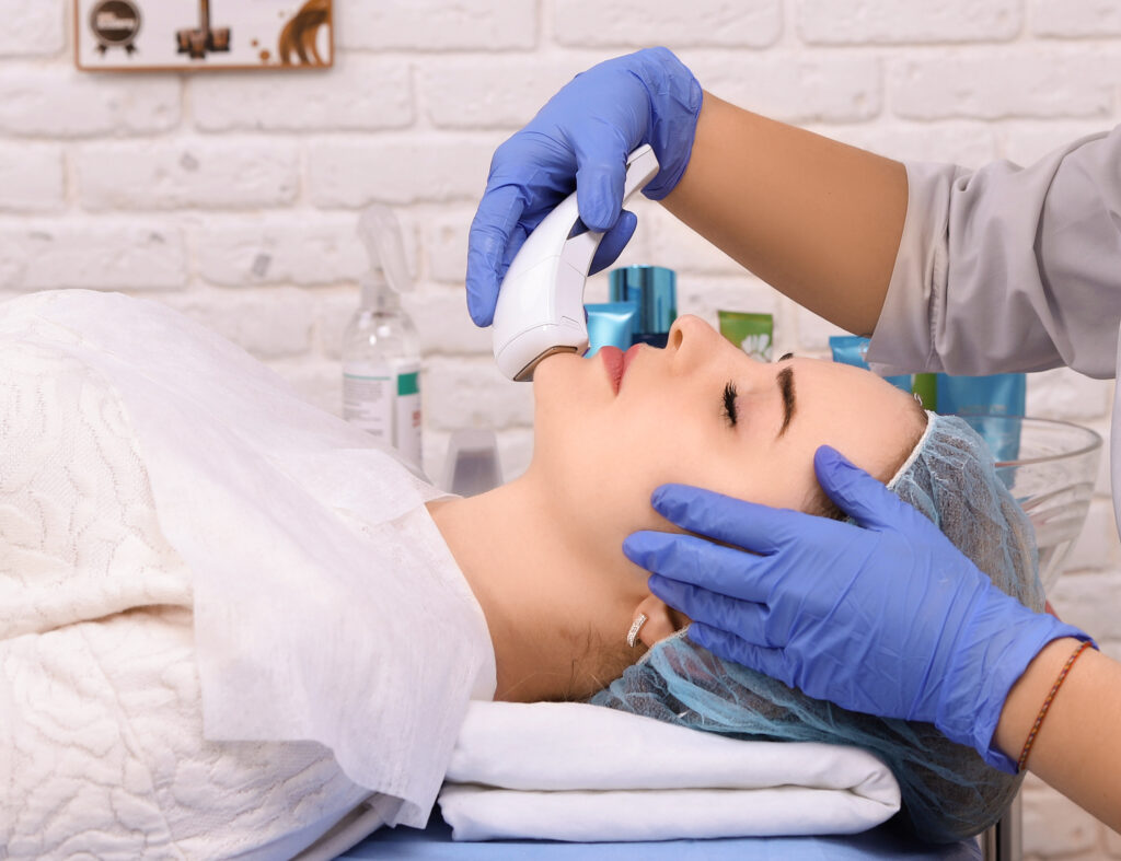 HydraFacial is a non-invasive, multi-step facial treatment that combines cleansing, exfoliation, extraction, hydration, and antioxidant protection. It uses patented vortex technology to deliver immediate and noticeable results without downtime or irritation. Suitable for all skin types!Removes dirt, oil & dead skin cells.Facial massage at beauty salon. Electric stimulation skin care of woman. Professional equipment for microcurrent lift face. Anti aging face and neck rejuvenation and non surgical treatment indoor.